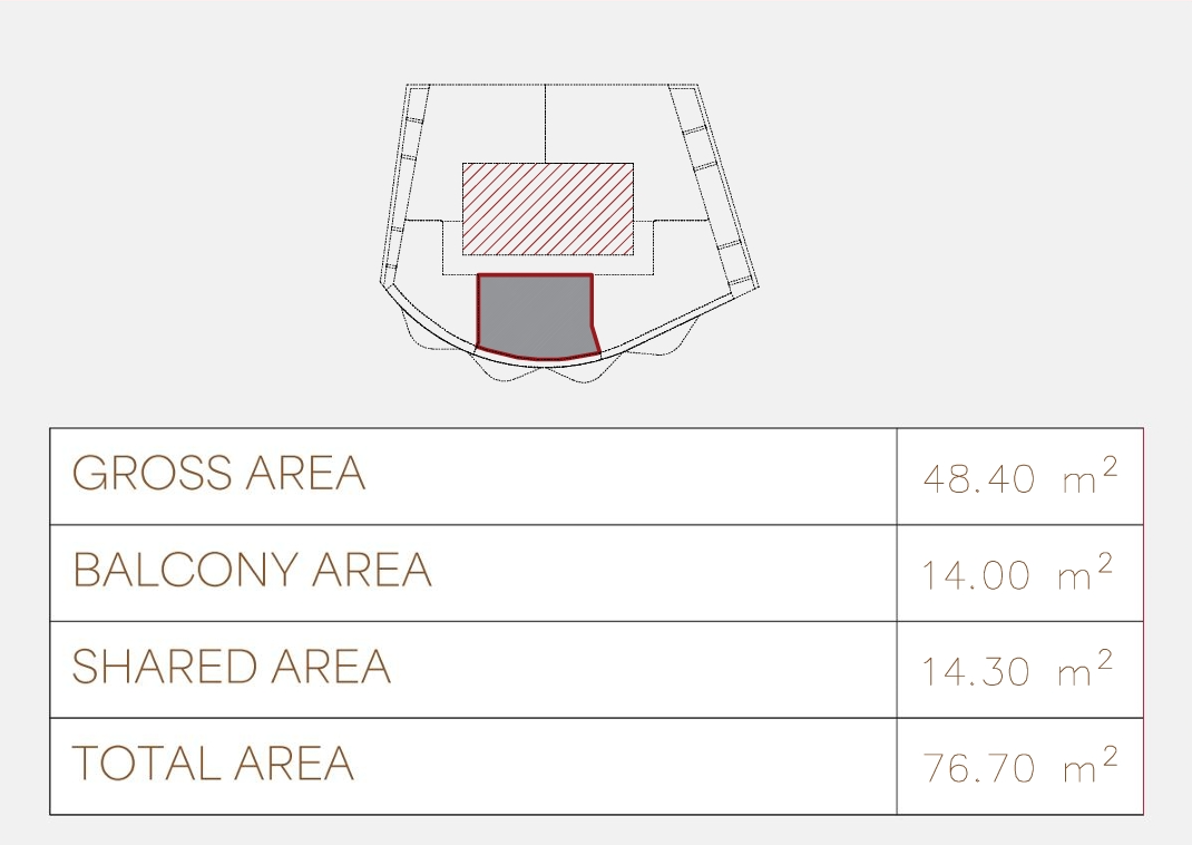Powierzchnia całkowita 76,7m2, powierzchnia wewnętrzna 48,4m2 + balkon 14m2