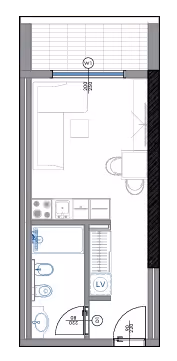 - Pokój z aneksem kuchennym – przestronny i jasny, z wyjściem na balkon, idealny do wypoczynku.